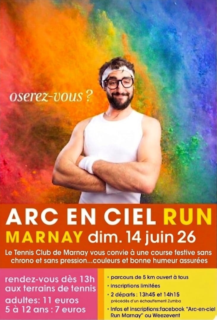 Vous étiez impatients depuis l'année dernière de revivre une journée colorée pleine d'émotion, de rigolade, sportive, à partager en famille, entre ami(e)s, entre collègues de travail...! Et bien, c'est parti, la 7ème édition de L'Arc-en-Ciel Run 2026 organisée par le Tennis Club de Marnay vous attend le dimanche 14 juin !